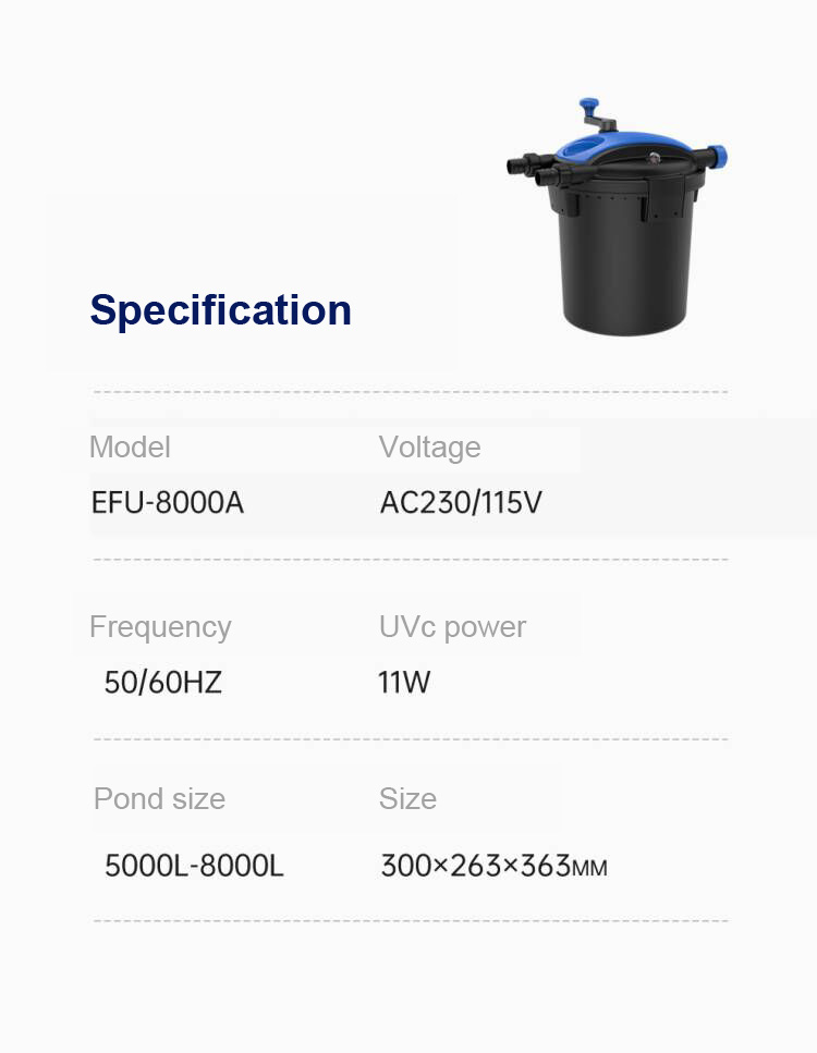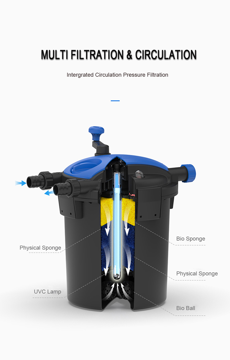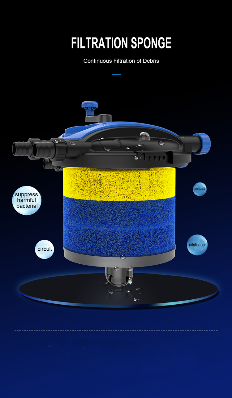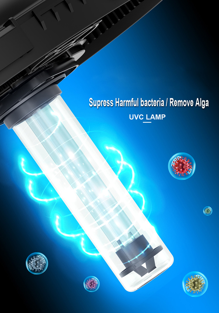 • Build-in UVC lamp can kill algae, virus and harmfulbacterium in the water .