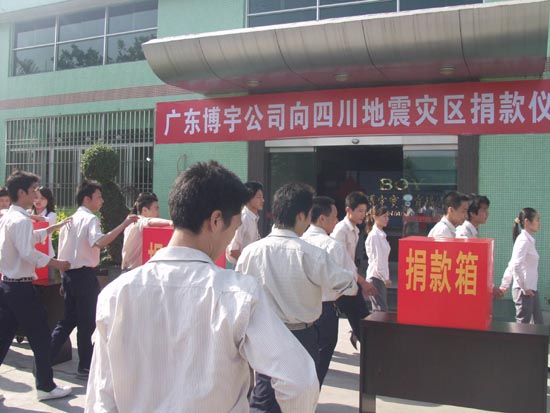 5.12四川汶川大地震牽動著全國13億人民的心!災害至今已造成數萬人罹難,數十萬人流離失所,把無數陽光下鮮活的生命永遠地帶入黑暗世界,造成巨大的人員傷亡和財產損失。一方有難,八方支援!在無法抗拒的大自然災害面前,只有愛才是人類永恒的力量,只有愛才是人類共同抗擊自然災難的偉大力量!博宇公司董事長余炳炎、總經理余建勤帶頭率領并倡議全體員工向災區人民及時伸出援助之手。